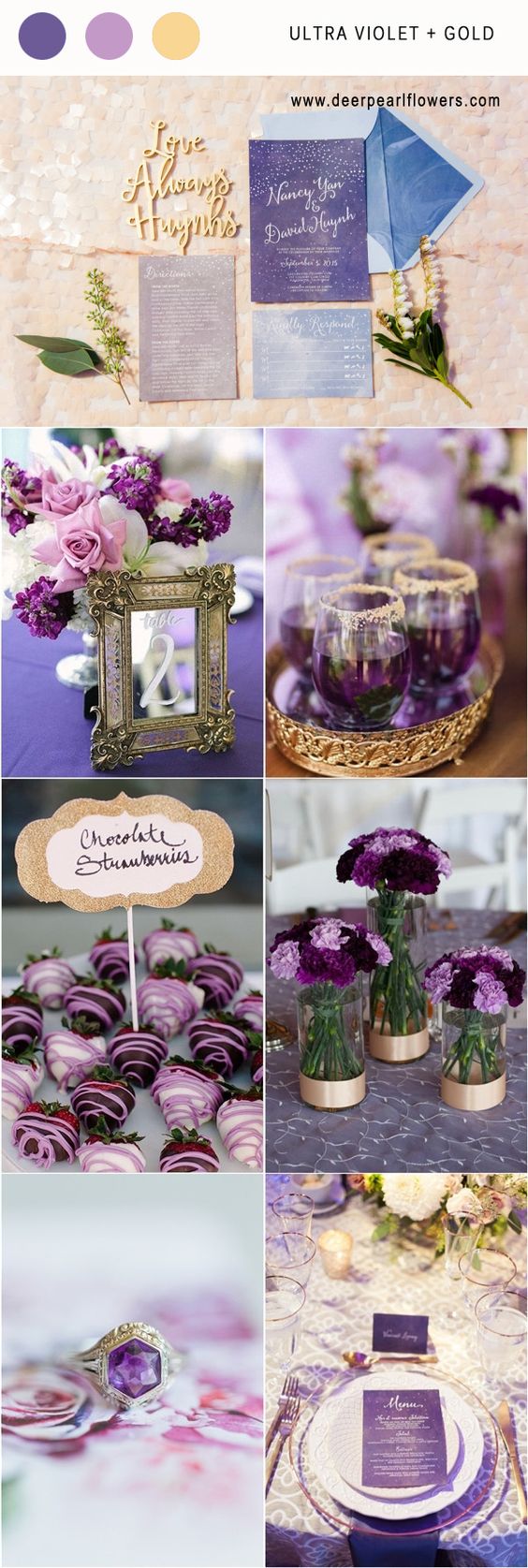 En una tonalidad más fresca, nuevamente con dorado, degradé del ultra violet. Ideal para bodas de salón o al aire libre. En los pasteles vemos estos tonos implementados claramente en flores y ribetes oro dando como resultado pasteles muy románticos que prevalecen todos los tiempos.